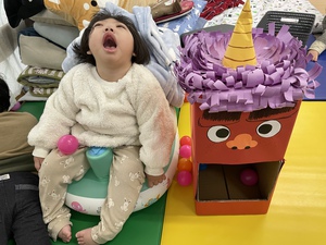 あーんと大きなお口を開けた鬼さんのお口にボールを投げ入れ鬼退治しました。