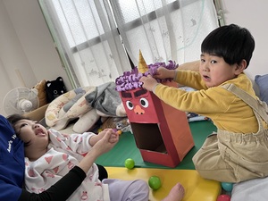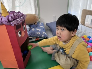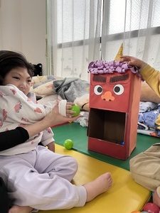 鬼の顔をした箱にボールを投げ入れて